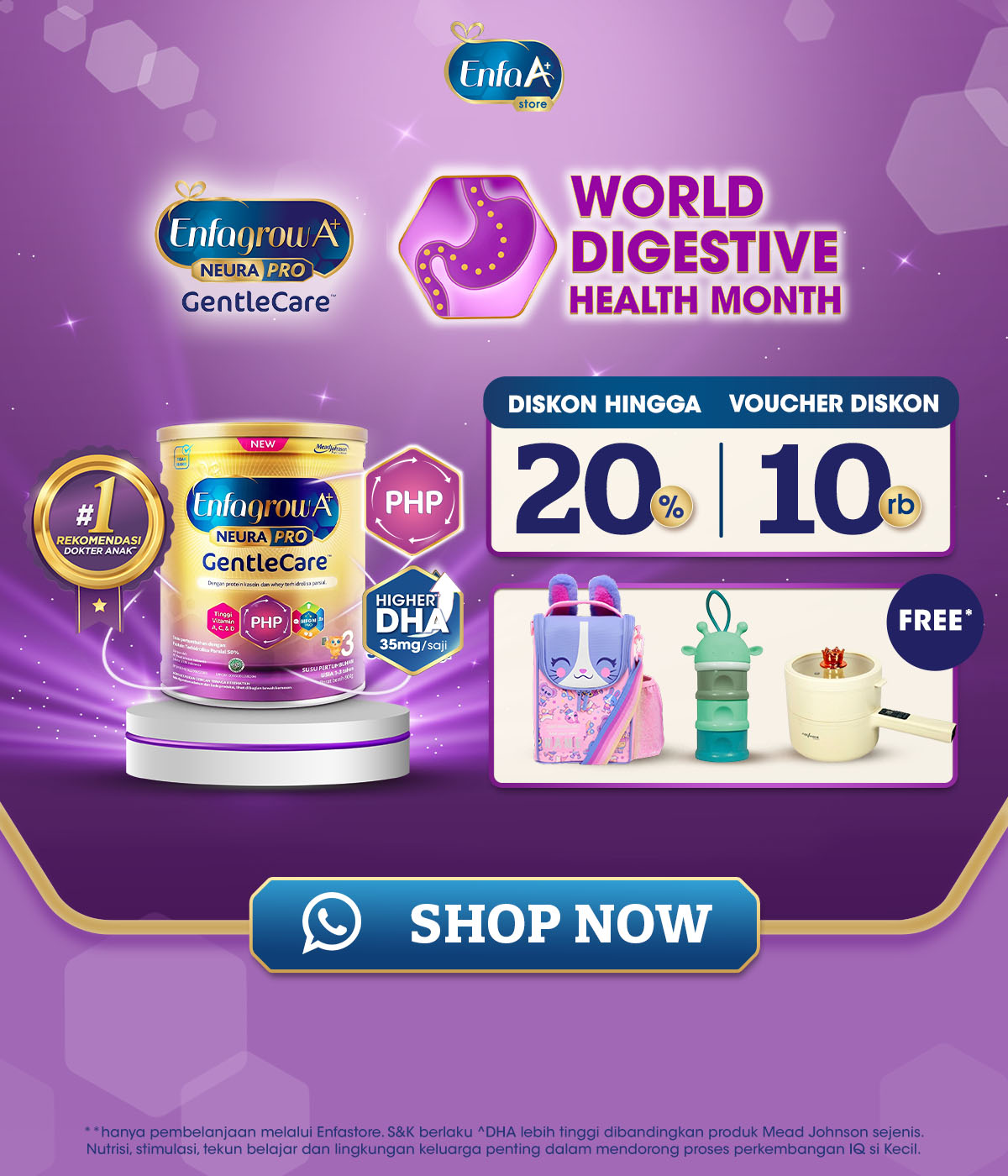• Promosi hanya berlaku untuk Enfamama A+, Enfagrow A+ Step 3 & Step 4, Enfagrow Essential Step 3 & Step 4, Gentlecare 3, Sustagen Junior, Sustagen Kid dan Sustagen School.